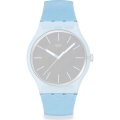 Dit Swatch horlogebandje is gemaakt van siliconen en wordt aan het horloge bevestigd door middel van stalen pennen. De band heeft een breedte van 19.7 mm en wordt gesloten door middel van een gesp. De band heeft geen rechte aanzet wat betekent dat deze band alleen geschikt is voor de horloges die hieronder worden vermeld.