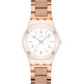 Dit Swatch horlogebandje is gemaakt van roestvrij staal en wordt aan het horloge bevestigd door middel van stalen pennen. De band heeft een breedte van 17 mm en wordt gesloten door middel van een vlindersluiting met drukknoppen. De band heeft geen rechte aanzet wat betekent dat deze band alleen geschikt is voor de horloges die hieronder worden vermeld.