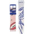 Dit Swatch horlogebandje is gemaakt van siliconen en wordt aan het horloge bevestigd door middel van stalen pennen. De band heeft een breedte van 19.7 mm en wordt gesloten door middel van een gesp. De band heeft geen rechte aanzet wat betekent dat deze band alleen geschikt is voor de horloges die hieronder worden vermeld.