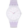 Dit Swatch horlogebandje is gemaakt van siliconen en wordt aan het horloge bevestigd door middel van stalen pennen. De band heeft een breedte van 19.7 mm en wordt gesloten door middel van een gesp. De band heeft geen rechte aanzet wat betekent dat deze band alleen geschikt is voor de horloges die hieronder worden vermeld.