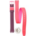 Dit Swatch horlogebandje is gemaakt van siliconen en wordt aan het horloge bevestigd door middel van stalen pennen. De band heeft een breedte van 12 mm en wordt gesloten door middel van een gesp. De band heeft geen rechte aanzet wat betekent dat deze band alleen geschikt is voor de horloges die hieronder worden vermeld.