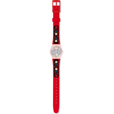 Dit Swatch horlogebandje is gemaakt van siliconen en wordt aan het horloge bevestigd door middel van stalen pennen. De band heeft een breedte van 12 mm en wordt gesloten door middel van een gesp. De band heeft geen rechte aanzet wat betekent dat deze band alleen geschikt is voor de horloges die hieronder worden vermeld.