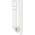 Dit Swatch horlogebandje is gemaakt van siliconen en wordt aan het horloge bevestigd door middel van stalen pennen. De band heeft een breedte van 12 mm en wordt gesloten door middel van een gesp. De band heeft geen rechte aanzet wat betekent dat deze band alleen geschikt is voor de horloges die hieronder worden vermeld.