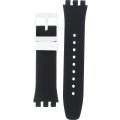 Dit Swatch horlogebandje is gemaakt van siliconen en wordt aan het horloge bevestigd door middel van stalen pennen. De band heeft een breedte van 20.1 mm en wordt gesloten door middel van een gesp. De band heeft geen rechte aanzet wat betekent dat deze band alleen geschikt is voor de horloges die hieronder worden vermeld.