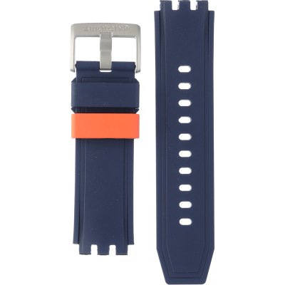 Dit Swatch horlogebandje is gemaakt van rubber en wordt aan het horloge bevestigd door middel van stalen pennen. De band heeft een breedte van 19.7 mm en wordt gesloten door middel van een gesp. De band heeft geen rechte aanzet wat betekent dat deze band alleen geschikt is voor de horloges die hieronder worden vermeld.