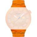 Dit Swatch horlogebandje is gemaakt van bio-plastic en wordt aan het horloge bevestigd door middel van stalen pennen. De band heeft een breedte van 19.7 mm en wordt gesloten door middel van een vlindersluiting met drukknoppen. De band heeft geen rechte aanzet wat betekent dat deze band alleen geschikt is voor de horloges die hieronder worden vermeld.