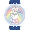 Dit Swatch horlogebandje is gemaakt van siliconen en wordt aan het horloge bevestigd door middel van stalen pennen. De band heeft een breedte van 19.7 mm en wordt gesloten door middel van een gesp. De band heeft geen rechte aanzet wat betekent dat deze band alleen geschikt is voor de horloges die hieronder worden vermeld.