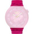 Dit Swatch horlogebandje is gemaakt van bio-plastic en wordt aan het horloge bevestigd door middel van stalen pennen. De band heeft een breedte van 19.7 mm en wordt gesloten door middel van een vlindersluiting met drukknoppen. De band heeft geen rechte aanzet wat betekent dat deze band alleen geschikt is voor de horloges die hieronder worden vermeld.