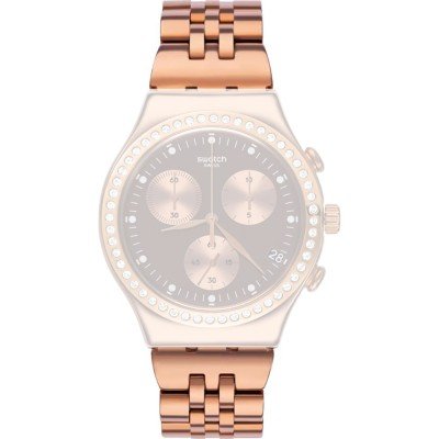 Dit Swatch horlogebandje is gemaakt van roestvrij staal en wordt aan het horloge bevestigd door middel van stalen pennen. De band heeft een breedte van 19.7 mm en wordt gesloten door middel van een vouwsluiting met veiligheidsklep. De band heeft geen rechte aanzet wat betekent dat deze band alleen geschikt is voor de horloges die hieronder worden vermeld.