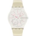 Dit Swatch horlogebandje is gemaakt van siliconen en wordt aan het horloge bevestigd door middel van stalen pennen. De band heeft een breedte van 19.7 mm en wordt gesloten door middel van een gesp. De band heeft geen rechte aanzet wat betekent dat deze band alleen geschikt is voor de horloges die hieronder worden vermeld.