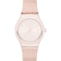 Dit Swatch horlogebandje is gemaakt van siliconen en wordt aan het horloge bevestigd door middel van stalen pennen. De band heeft een breedte van 19.6 mm en wordt gesloten door middel van een gesp. De band heeft geen rechte aanzet wat betekent dat deze band alleen geschikt is voor de horloges die hieronder worden vermeld.