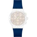 Dit Swatch horlogebandje is gemaakt van rubber en wordt aan het horloge bevestigd door middel van stalen pennen. De band heeft een breedte van 21 mm en wordt gesloten door middel van een gesp. De band heeft geen rechte aanzet wat betekent dat deze band alleen geschikt is voor de horloges die hieronder worden vermeld.