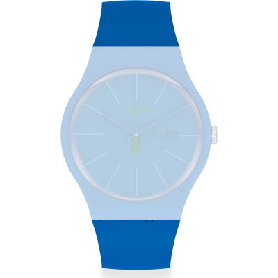 Dit Swatch horlogebandje is gemaakt van bio-plastic en wordt aan het horloge bevestigd door middel van stalen pennen. De band heeft een breedte van 19.7 mm en wordt gesloten door middel van een gesp. De band heeft geen rechte aanzet wat betekent dat deze band alleen geschikt is voor de horloges die hieronder worden vermeld.