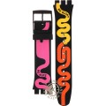 Dit Swatch horlogebandje is gemaakt van siliconen en wordt aan het horloge bevestigd door middel van stalen pennen. De band heeft een breedte van 19.7 mm en wordt gesloten door middel van een gesp. De band heeft geen rechte aanzet wat betekent dat deze band alleen geschikt is voor de horloges die hieronder worden vermeld.