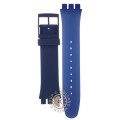 Dit Swatch horlogebandje is gemaakt van siliconen en wordt aan het horloge bevestigd door middel van stalen pennen. De band heeft een breedte van 19.7 mm en wordt gesloten door middel van een gesp. De band heeft geen rechte aanzet wat betekent dat deze band alleen geschikt is voor de horloges die hieronder worden vermeld.