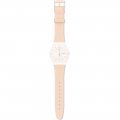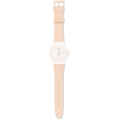 Dit Swatch horlogebandje is gemaakt van siliconen en wordt aan het horloge bevestigd door middel van stalen pennen. De band heeft een breedte van 19.7 mm en wordt gesloten door middel van een gesp. De band heeft geen rechte aanzet wat betekent dat deze band alleen geschikt is voor de horloges die hieronder worden vermeld.