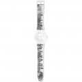 Dit Swatch horlogebandje is gemaakt van siliconen en wordt aan het horloge bevestigd door middel van stalen pennen. De band heeft een breedte van 19.7 mm en wordt gesloten door middel van een gesp. De band heeft geen rechte aanzet wat betekent dat deze band alleen geschikt is voor de horloges die hieronder worden vermeld.