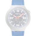 Dit Swatch horlogebandje is gemaakt van siliconen en wordt aan het horloge bevestigd door middel van stalen pennen. De band heeft een breedte van 19.7 mm en wordt gesloten door middel van een gesp. De band heeft geen rechte aanzet wat betekent dat deze band alleen geschikt is voor de horloges die hieronder worden vermeld.