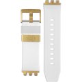 Dit Swatch horlogebandje is gemaakt van siliconen en wordt aan het horloge bevestigd door middel van stalen pennen. De band heeft een breedte van 19.7 mm en wordt gesloten door middel van een gesp. De band heeft geen rechte aanzet wat betekent dat deze band alleen geschikt is voor de horloges die hieronder worden vermeld.