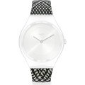 Dit Swatch horlogebandje is gemaakt van textiel en wordt aan het horloge bevestigd door middel van stalen pennen. De band heeft een breedte van 15.9 mm en wordt gesloten door middel van een gesp. De band heeft geen rechte aanzet wat betekent dat deze band alleen geschikt is voor de horloges die hieronder worden vermeld.