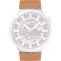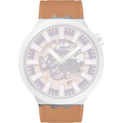 Dit Swatch horlogebandje is gemaakt van rubber en wordt aan het horloge bevestigd door middel van stalen pennen. De band heeft een breedte van 19.7 mm en wordt gesloten door middel van een gesp. De band heeft geen rechte aanzet wat betekent dat deze band alleen geschikt is voor de horloges die hieronder worden vermeld.