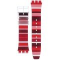 Dit Swatch horlogebandje is gemaakt van siliconen en wordt aan het horloge bevestigd door middel van stalen pennen. De band heeft een breedte van 19.7 mm en wordt gesloten door middel van een gesp. De band heeft geen rechte aanzet wat betekent dat deze band alleen geschikt is voor de horloges die hieronder worden vermeld.