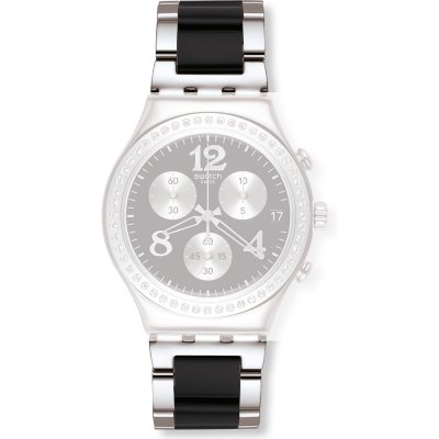 Dit Swatch horlogebandje is gemaakt van roestvrij staal en wordt aan het horloge bevestigd door middel van stalen pennen. De band heeft een breedte van 19.7 mm en wordt gesloten door middel van een vouwsluiting met drukknoppen en veiligheidsklep. De band heeft geen rechte aanzet wat betekent dat deze band alleen geschikt is voor de horloges die hieronder worden vermeld.