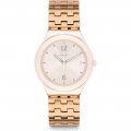 Dit Swatch horlogebandje is gemaakt van roestvrij staal en wordt aan het horloge bevestigd door middel van stalen pennen. De band heeft een breedte van 17 mm en wordt gesloten door middel van een vouwsluiting met drukknoppen en veiligheidsklep. De band heeft geen rechte aanzet wat betekent dat deze band alleen geschikt is voor de horloges die hieronder worden vermeld.