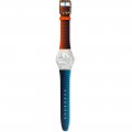 Dit Swatch horlogebandje is gemaakt van textiel op leer en wordt aan het horloge bevestigd door middel van stalen pennen. De band heeft een breedte van 17 mm en wordt gesloten door middel van een gesp. De band heeft geen rechte aanzet wat betekent dat deze band alleen geschikt is voor de horloges die hieronder worden vermeld.
