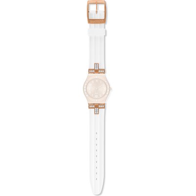 Dit Swatch horlogebandje is gemaakt van siliconen en wordt aan het horloge bevestigd door middel van stalen pennen. De band heeft een breedte van 17 mm en wordt gesloten door middel van een gesp. De band heeft geen rechte aanzet wat betekent dat deze band alleen geschikt is voor de horloges die hieronder worden vermeld.