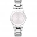 Dit Swatch horlogebandje is gemaakt van roestvrij staal en wordt aan het horloge bevestigd door middel van stalen pennen. De band heeft een breedte van 17 mm en wordt gesloten door middel van een vouwsluiting met drukknoppen en veiligheidsklep. De band heeft geen rechte aanzet wat betekent dat deze band alleen geschikt is voor de horloges die hieronder worden vermeld.