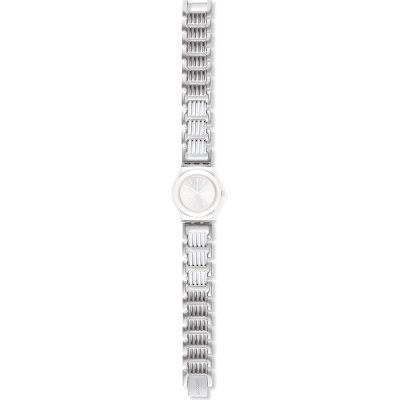 Dit Swatch horlogebandje is gemaakt van roestvrij staal en wordt aan het horloge bevestigd door middel van stalen pennen. De band heeft een breedte van 12 mm en wordt gesloten door middel van een sieraadsluiting. De band heeft geen rechte aanzet wat betekent dat deze band alleen geschikt is voor de horloges die hieronder worden vermeld.