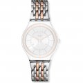 Dit Swatch horlogebandje is gemaakt van roestvrij staal en wordt aan het horloge bevestigd door middel van stalen pennen. De band heeft een breedte van 18.9 mm en wordt gesloten door middel van een vouwsluiting met drukknoppen en veiligheidsklep. De band heeft geen rechte aanzet wat betekent dat deze band alleen geschikt is voor de horloges die hieronder worden vermeld.