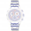 Dit Swatch horlogebandje is gemaakt van aluminium en wordt aan het horloge bevestigd door middel van stalen pennen. De band heeft een breedte van 19.7 mm en wordt gesloten door middel van een vouwsluiting met drukknoppen en veiligheidsklep. De band heeft geen rechte aanzet wat betekent dat deze band alleen geschikt is voor de horloges die hieronder worden vermeld.