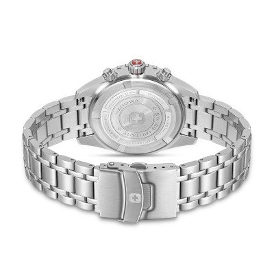 Dit Swiss Military Hanowa horloge heeft een kast gemaakt van Staal zilver met een diameter van 44 mm en is voorzien van een Staal zilver band. In de kast bevindt zich een Ronda kwaliteitsuurwerk en is afgewerkt met Saffierglas.