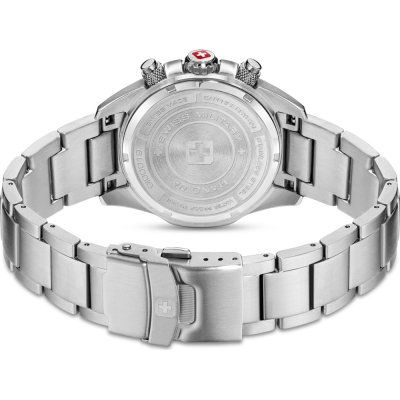 Dit Swiss Military Hanowa horloge heeft een kast gemaakt van Staal zilver met een diameter van 44 mm en is voorzien van een Staal zilver band. In de kast bevindt zich een Timex kwaliteitsuurwerk en is afgewerkt met Saffierglas.