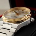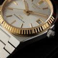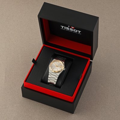 Met 35 mm is de Tissot PRX Powermatic 80 gericht op vrouwen, maar het modernistische ontwerp kan ook mannen met een slankere pols aanspreken. Het horloge maakt deel uit van de iconische PRX familie van geïntegreerde armbandhorloges met één extra: de geribbelde lunette van dit horloge is gemaakt van 18 kt goud en contrasteert prachtig met de zilverkleurige sunray-gepolijste roestvrijstalen wijzerplaat. Het geeft dit verder zo strak ontworpen horloge een vleugje luxe en elegantie.