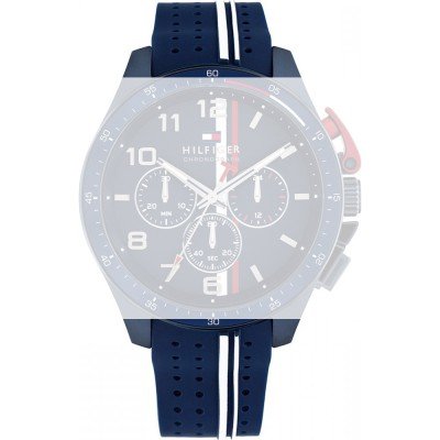 Dit Tommy Hilfiger horlogebandje is gemaakt van siliconen en wordt aan het horloge bevestigd door middel van bandpennen. De band heeft een breedte van 21 mm en wordt gesloten door middel van een gesp. De band heeft geen rechte aanzet wat betekent dat deze band alleen geschikt is voor de horloges die hieronder worden vermeld.
