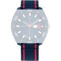 Dit Tommy Hilfiger horlogebandje is gemaakt van textiel en wordt aan het horloge bevestigd door middel van bandpennen. De band heeft een breedte van 21 mm en wordt gesloten door middel van een gesp. De band heeft een rechte aanzet wat betekent dat deze band geschikt is voor alle Tommy Hilfiger horloges met een rechte aanzet.