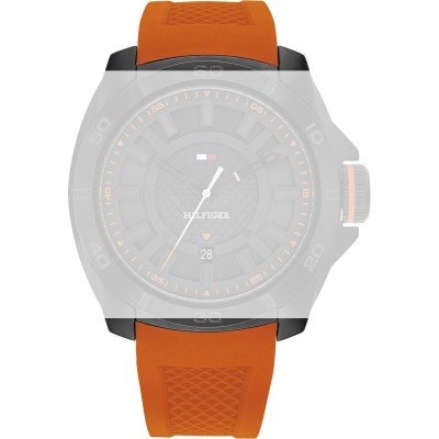 Dit Tommy Hilfiger horlogebandje is gemaakt van siliconen en wordt aan het horloge bevestigd door middel van bandpennen. De band heeft een breedte van 24 mm en wordt gesloten door middel van een gesp. De band heeft geen rechte aanzet wat betekent dat deze band alleen geschikt is voor de horloges die hieronder worden vermeld.