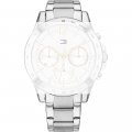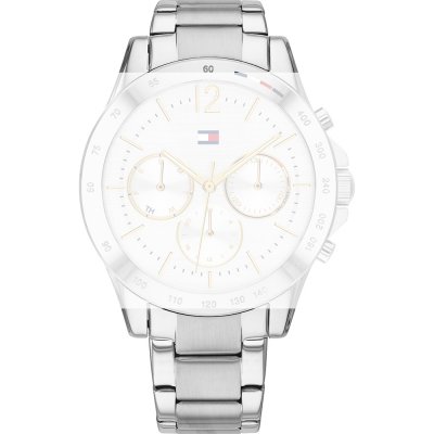 Dit Tommy Hilfiger horlogebandje is gemaakt van roestvrij staal en wordt aan het horloge bevestigd door middel van bandpennen. De band heeft een breedte van 18 mm en wordt gesloten door middel van een vouwsluiting met drukknoppen. De band heeft geen rechte aanzet wat betekent dat deze band alleen geschikt is voor de horloges die hieronder worden vermeld.