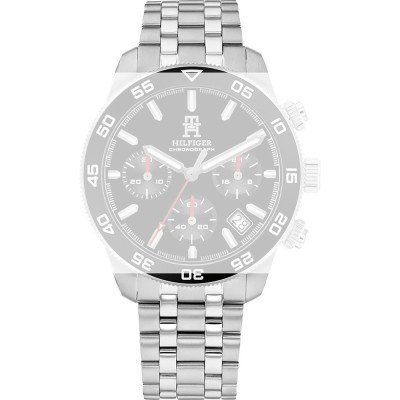 Dit Tommy Hilfiger horlogebandje is gemaakt van roestvrij staal en wordt aan het horloge bevestigd door middel van bandpennen. De band heeft een breedte van 20 mm en wordt gesloten door middel van een vouwsluiting met drukknoppen. De band heeft geen rechte aanzet wat betekent dat deze band alleen geschikt is voor de horloges die hieronder worden vermeld.