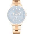 Dit Tommy Hilfiger horlogebandje is gemaakt van roestvrij staal en wordt aan het horloge bevestigd door middel van bandpennen. De band heeft een breedte van 19 mm en wordt gesloten door middel van een vouwsluiting met drukknoppen. De band heeft geen rechte aanzet wat betekent dat deze band alleen geschikt is voor de horloges die hieronder worden vermeld.