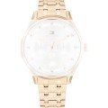 Dit Tommy Hilfiger horlogebandje is gemaakt van roestvrij staal en wordt aan het horloge bevestigd door middel van bandpennen. De band heeft een breedte van 18 mm en wordt gesloten door middel van een vouwsluiting met drukknoppen. De band heeft geen rechte aanzet wat betekent dat deze band alleen geschikt is voor de horloges die hieronder worden vermeld.