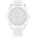 Dit Tommy Hilfiger horlogebandje is gemaakt van siliconen en wordt aan het horloge bevestigd door middel van bandpennen. De band heeft een breedte van 19 mm en wordt gesloten door middel van een gesp. De band heeft geen rechte aanzet wat betekent dat deze band alleen geschikt is voor de horloges die hieronder worden vermeld.
