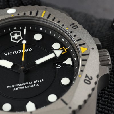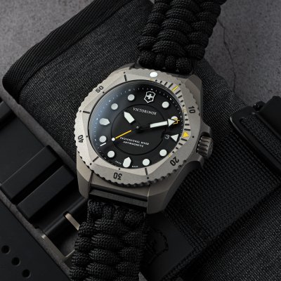 De Victorinox Dive Pro quartz horloges zijn verkrijgbaar in zowel staal als titanium en met verschillende banden, van felgekleurd rubber tot praktisch paracord. Wat ze delen is een krachtig Zwitsers Ronda quartz uurwerk, ISO 6425 certificering, 30 ATM waterdichtheid, een unidirectionele draaibare bezel en goed zichtbare indexen en wijzers. Het horloge is ontworpen, vervaardigd en getest in de eigen fabriek van Victorinox in DelĂŠmont, Zwitserland en wordt geleverd in een doos met een extra bandje en een etui voor accessoires.